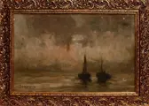 Prachtig olieverfschilderij op canvas gemaakt door een getalenteerde impressionistische schilder die actief was in België tussen eind 1800 en begin 1900. Het canvas, met sporen van de signatuur "SIMONI (?)" in de linker benedenhoek, geeft een glimp weer van een uitzicht op zee, met een close-up van twee boten die bij zonsondergang aan de kust liggen afgemeerd.