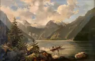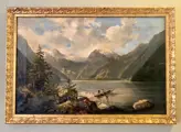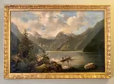 Buitengewoon landschap uit het einde van de 19e eeuw, een uitzicht van opmerkelijke kwaliteit dat herinnert aan een ideale poëtische glimp, in een elegante, eeuwenoude lijst in hout en bladgoud