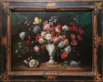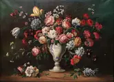 In het rijke en gevarieerde Florentijnse laatbarokke artistieke panorama behoort een interessante, zij het niet prominente, positie tot het picturale genre van stillevens, in het bijzonder tot bloemcomposities. De onbetwiste hoofdrolspelers in deze picturale sector waren Bartolomeo Bimbi en Andrea Scacciati. De compositorische kenmerken van deze elegante vaas met bloemen roepen in feite de resultaten op van de Florentijnse schilder Andrea Scacciati (Florence, 1642 - 1710).
