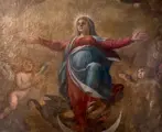 Groot schilderij, zeer zeldzaam, van behoorlijk formaat uit een kerk, altaarstuk in populaire stijl in goede staat. Hier is de benadering uitgesproken devotioneel: het hoogfeest van de Onbevlekte Ontvangenis van de Maagd Maria, dat al sinds de 11e eeuw wordt gevierd, past in de context van advent en Kerstmis en verbindt de messiaanse verwachting en de glorieuze wederkomst van Christus met de herinnering aan de Moeder. In die zin moet deze liturgische periode worden beschouwd als een bijzonder geschikte tijd voor de aanbidding van de Moeder van de Heer. Maria is volkomen heilig, immuun voor elke smet van zonde, bijna gevormd door de Heilige Geest en gemaakt tot een nieuw schepsel. Reeds profetisch voorafschaduwd in de belofte aan haar eerste ouders van overwinning op de slang, is Maria de Maagd die zwanger zal worden en een zoon zal baren wiens naam Emmanuel zal zijn. Het dogma van de Onbevlekte Ontvangenis werd in 1854 door Pius IX afgekondigd met de stier Ineffabilis Deus. In de katholieke devotie wordt de Onbevlekte Ontvangenis verbonden met de verschijningen van Lourdes (1858) en iconografisch met de eerdere verschijningen van de Rue du Bac in Parijs (1830).