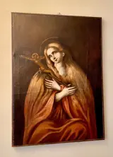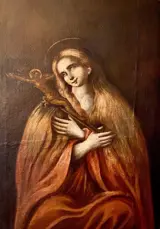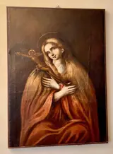 Dit buitengewone vrouwelijke personage, dat de creativiteit van alle grote meesters van de oude schilderkunst stimuleerde, wordt door de auteur zo afgebeeld dat het hem buitengewoon bescheiden maakt, met een heel lief en onschuldig gezicht. De Magdalena biedt de toeschouwer niet haar blote borsten en lome blik aan, maar bedekt eerder haar borst met haar linkerhanden in een gebaar van maximale kalmte, terwijl ze het kruisbeeld eroverheen draagt.