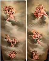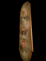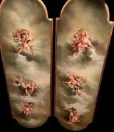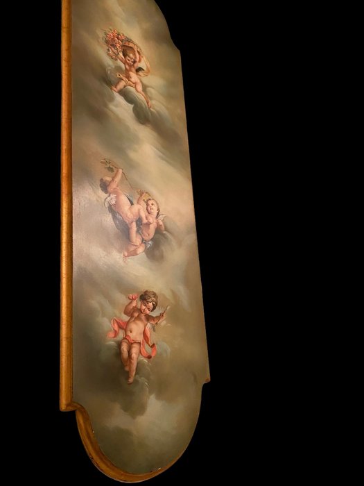 Handbeschilderd uniek model. Uitstekende staat. Het eerste schilderij stelt een engel voor met een mand rozen, centraal twee spelende engelen en daaronder een engel met een pijl. Het tweede schilderij stelt in het midden twee engelen van boven voor met een druiventros en een tros in de hand, centraal twee engelen, één met een aureool in de hand naast een duif en de derde stelt twee engelen voor, waarvan er één een duif omarmt. Handbeschilderd, olieverf op paneel, Italië jaren 40