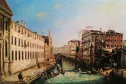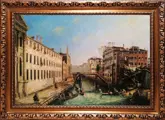Deze afbeelding verwijst naar het origineel gemaakt door Canaletto Il Rio dei Mercanti (olieverf op doek, cm. 144 x 207, datering 1721-24, Fondazione Musei Civici Venezia, Cà Rezzonico, Inv. CI. I, n. 2326), model van een groot aantal andere meesterwerken. De boten en de personages veranderen soms, en dat geldt ook voor het standpunt dat met de optische camera is vastgelegd. Het resultaat is echter altijd buitengewoon en perfect. Het originele schilderij, samen met zijn tegenhanger, die het Canal Grande van Palazzo Balbi naar Rialto afbeeldt, is een van de vroege meesterwerken van Canaletto. Beide doeken, aangekocht door de gemeente Venetië in 1983 van de erfgenamen van senator Mario Crespi, maakten oorspronkelijk deel uit van een serie van vier aanzichten die eigendom waren van de prinsen van Liechtenstein (de andere twee bevinden zich nu in het Thyssen-Bornemisza-museum in Madrid). Vanaf deze eerste werken verheft Canaletto Venetië dat wordt opgevat als een 'waterstad', waarbij hij de vormen en ruimtes uitbreidt met behulp van perspectiefhulpmiddelen die hij tijdens zijn opleiding als decorontwerper had geleerd. Aan het gebruikelijke landschapsrepertoire, gecentreerd rond het San Marcoplein, voegt de kunstenaar ongepubliceerde opnamen toe, gewijd aan de minder bekende hoeken van Venetië. Dit is het geval van de Rio dei Mendicanti, waar de schilder zijn aandacht vestigt op een populair gebied, beschreven in al zijn bescheiden schoonheid. Canaletto bezinkt in de compositie een ongekende diepte van waarheid, verkregen door een buitengewoon gebruik van licht dat in de scène barst, het verlicht en duidelijk waarneembaar maakt, zelfs het kleinste element. Dit effect wordt bereikt door, bijna brutaal, de tekenen van de picturale operatie te tonen: volle en gerafelde penseelstreken die de toeschouwer een concreet beeld van de stad bieden.
