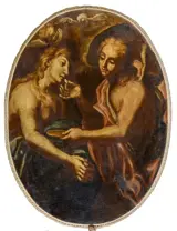 Olieverfschilderij op canvas. Centraal in de compositie ontvangt Maria Magdalena voor de laatste keer de communie van een engel, terwijl achter haar een Putto en de Heilige Geest (vertegenwoordigd door een duif) klaar staan om haar naar de hemel te laten opstijgen. Opnieuw bekleden en nieuw frame. Enkele restauraties verspreid over de bodem, restauratiepunten op het vlees en op de kleding. Grondige reiniging wordt aanbevolen
