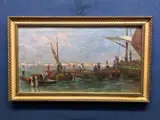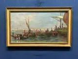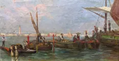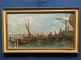 Fascinerend olieverfschilderij van de Venetiaanse school, gemaakt in het begin van de twintigste eeuw, met een karakteristiek uitzicht op Venetië met typische boten uit die tijd en talloze personages die elk hun taak willen uitvoeren