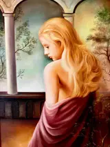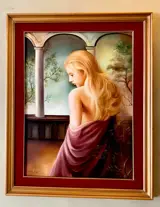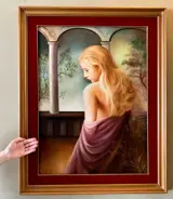 Majestueus olieverfschilderij op canvas. Heerlijk leven. Een van de meest verheven werken van Maestro Ughi, geschilderd rond 1980. Schilder Sergio Alessandro Ughi heeft zijn vaardigheden in figuratie, gedeeltelijke abstractie en een individuele reeks tekens en symbolische elementen in de afgelopen drie decennia aangescherpt en is een van de grootste exponenten van het vrouwenportret geworden. in moderne Italiaanse kunst.