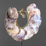 Deze schelpenketting heeft 'iriserende' schelpen: het fenomeen van bepaalde oppervlakken die geleidelijk van kleur lijken te veranderen naarmate de kijkhoek of de verlichtingshoek verandert