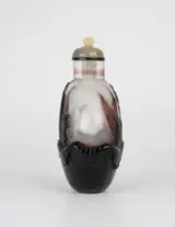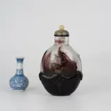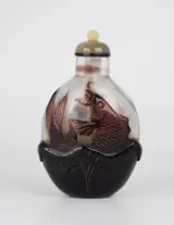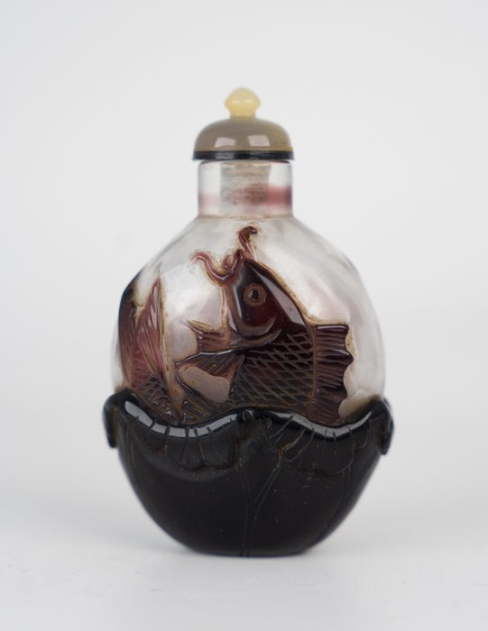 Een mooie antieke Chinese snuiffles, gemaakt van kostbaar Beijing paars overlay glas (mogelijk door de Imperial glasateliers), met decoratie van karper gedragen op een lotusblad. De knop van het blad is mooi uitgehold voor een stevige stand. Mooie vorm, goed uitgehold. Inclusief een jade stop zonder lepel. Handgemaakt in het oude China tijdens de Qing-dynastie, 19e eeuw. Gegarandeerd origineel en van de aangegeven periode.