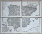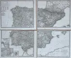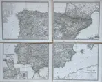 Zeer gedetailleerde kaarten van Spanje en Portugal op 4 losse bladen. Met inzet-detailkaartjes van Cadiz, Lissabon en Madrid. Titel en impressum rechtsonder.