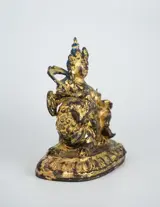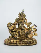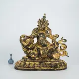 Groot verguld bronzen beeld van Guandi, gezeten in een woeste houding op een liggende Foo-leeuw (mythisch beest), zijn kop naar boven gekeerd, met woeste uitdrukking met open mond, de Guandi in een gewaad versierd met juwelen en kralenkettingen op de borst, de haar opgestoken in een hoge hoge knot, met een uitgebreide kroon met figuren. Het beeld heeft lagen van lapis lazuli, groene (smaragd?) en donkerblauwe stenen.