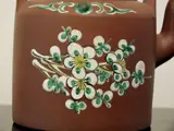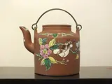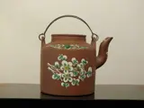 de theepot van samengedrukte bolvorm, het bronzen handvat en de tuit gemodelleerd om eruit te zien als takken, onderkant van de voet met een meesterteken, mooie beschildering aan beide zijden met vogel en bloemen. Erg zeldzaam!