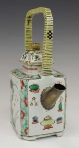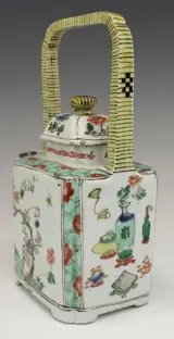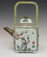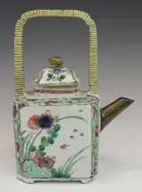 Quadrangular covered porcelain jug from the Kangxi period (1662-1722). Famille verte enamel decoration with motifs of rocks, branches, flowers, foliage, birds and butterflies on the long sides, and with 'hundred antiques' motifs on the short sides. The contours are underlined with floral and stylized motifs. Surmounted by a yellow enamelled handle imitating bamboo. Silver spout.