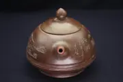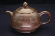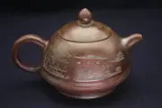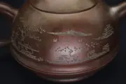 Grote theepot van yixing klei met uitgesneden landschap en kalligrafie, markeringen aan de onderkant