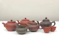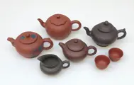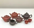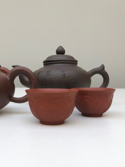 Mooie collectie van vier trekpotten, een kannetje en twee theekopjes gemaakt Yixing Zisha klei.