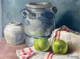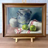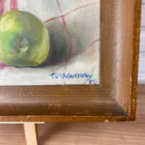 46,5x36,5 cm in houten frame, in goede condities, behalve een kleine beschadiging op oa de appel, zoals te zien op de foto.