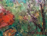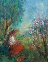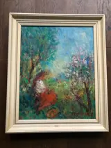 Impressionistisch schilderij van een meisje met picknickmand onder een bloesemboom; olie op doek, 50x40cm. (schilderij), rechtsonder gesigneerd. In goede staat, wel in een eenvoudige lijst (gebruikssporen).