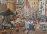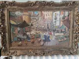 Olieverf op paneel van Maestro Ugo Mascolo met de oude poort van de stad Napels en zijn karakteristieke markt. Zeer verfijnd in de details met bijzondere kleuren waarin de uitstekende beeldkwaliteit wordt opgemerkt.