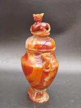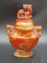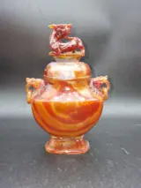 Gebeeldhouwde leeuwenbeestvaas Vaas met eenhoornhandvat Prachtig gesneden ontwerp met Foo Dog Head en reliëf gesneden ring. Prachtig agaat, geheel doorschijnend. goed bewaard gebleven. Kijk goed naar de foto's, onderdeel van de omschrijving.