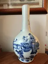 Een Chinese blauwe vaas uit de 20e eeuw met een afbeelding van een oude man en een spelend kind in de tuin, 23 cm hoog, in goede staat met lichte gebruikssporen en slijtage, volledig blootgesteld aan UV-licht.