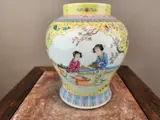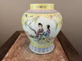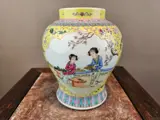 Fijne en zeldzame Chinese ca. Potvaas uit 1950 met een gele achtergrond. Versierd met dames in de tuin. Gemerkt Qianlong op de bodem. 20cm hoog en in perfecte staat. Wereldwijde verzending