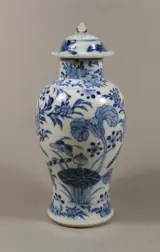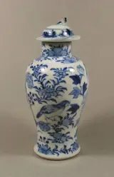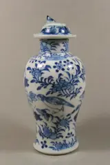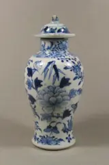 Een gemerkte Chinese blauwwitte balustervormige dekselvaas, 19e eeuw, ca 16 cm. hoog en 7cm. O.