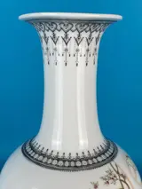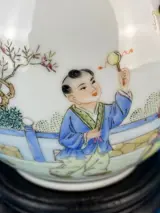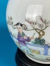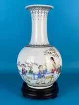 Decoratieve vaas in porselein van Chinese makelij, volledig bewerkt en met de hand beschilderd met populaire figuren, rood merk zichtbaar op de voet, 20e eeuw, uitstekende algemene staat van bewaring, vaasmaat 14x14xh23cm, totale hoogte met houten voet 26cm, zorgvuldige verpakking en traceerbare verzending.