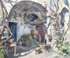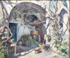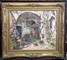 Olieverf op paneel met een binnenplaats in Ravello, gesigneerd V.White linksonder.