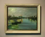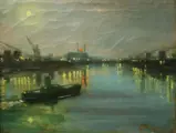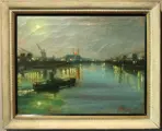 Fraai werk in olieverf op canvas voorstellende een nachtelijk zicht op een haven.