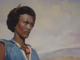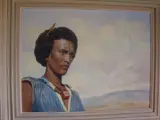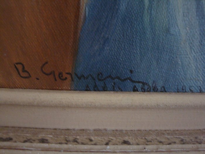 Vassilios Germenis (1896-1966) was een belangrijke Griekse schilder. Hij verhuisde in 1955 naar Ethiopië en werd hofschilder van keizer Haile Selassie. Hij bleef vijf jaar in Addis Abeba. Mijn grootvader was een van zijn vrienden in Griekenland en zo bezit ik dit zeldzame/unieke schilderij, een uitstekend portret van een Ethiopische held die op het platteland een leeuw vocht en doodde. gemaakt in 1957 in Addis Abeba (zie de notitie linksonder). Germenis' thema's omvatten portret, landschap, zeegezicht en compositie waarbij zijn stijl beweegt tussen realisme en expressionisme. Zijn werk is te vinden in de National Gallery of Athens, de Municipal Gallery of Athens, de Leventis Gallery, de Bank of Greece en vele andere openbare en particuliere collecties.
