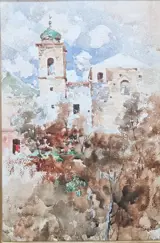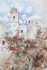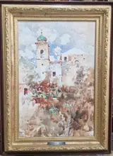 Aquarel op papier met een gezicht op Ravello, gesigneerd V.Irolli rechtsonder.