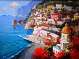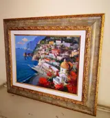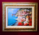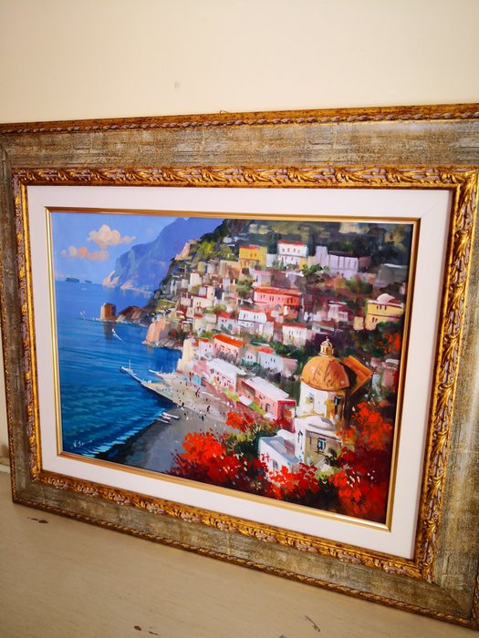 Spectaculaire en mooie olie op canvas 30 x 40 door de meester Vincenzo Somma die een prachtige hoek van Positano aan de kust van Amalfi afbeeldt (mooi).