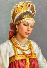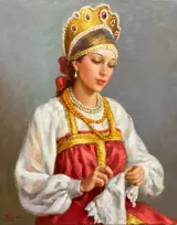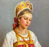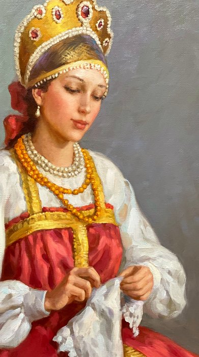 - Jonge prinses met parels - olieverf op doek, gesigneerd linksonder en getiteld in het Russisch op de achterkant.