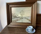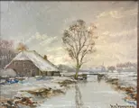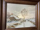 Prachtig nostalgisch winterlandschap van een typisch Hollands landschap met molen, gracht en boerderij. Oliebroek op canvas gevat in een antieke lijst.