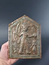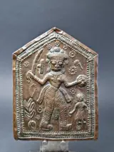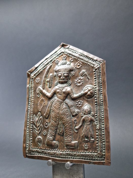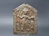 Een in reliëf gemaakte koperen votiefplaat die god voorstelt.