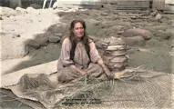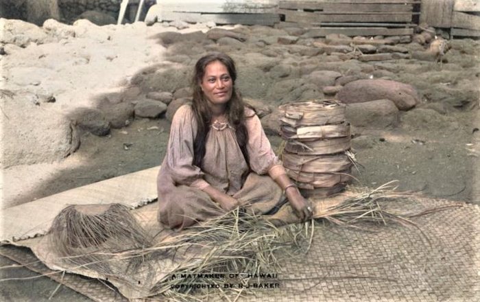 "De Hawaiiaanse vrouw Pila'a Kilani weeft een lauhala-mat in Pukoo, Molokai. Ze gebruikt hiervoor rollen geprepareerde pandanusbladeren, kūka'a."