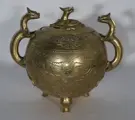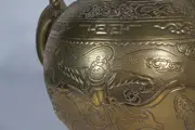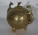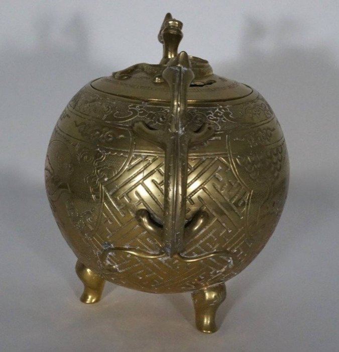 Een tripod wierookbrander met een gegraveerde decoratie van strijdtaferelen met 2 krijgers te paard. De deksel heeft een gemodelleerde liggende draak en de handvaten zijn in de vorm van grote draken. De onderzijde is gemerkt met een twee karaktermerk.