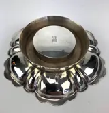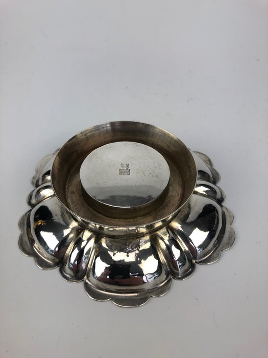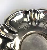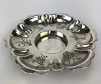 Zilveren kom met gegraveerde voorstellingen, wierookbrander of kaarsenstander.Gemerkt aan de onderzijde. Gewicht 84 gram. Diameter 11 cm en hoogte 2,5 cm.