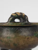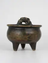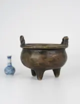 Een mooie kleine maar zeer zware antieke Chinese bronzen wierookbrander of wierookvat, staande op drie pootjes, twee mooi gebeeldhouwde oren en mooie bolle vorm. enkele ouderdomssporen, mooie patina, uitgevoerd in een mooie kwaliteit brons. Handgemaakt in het oude China tijdens de Qing-dynastie, 18e/19e eeuw. Op de achterzijde gemerkt met twee karakters in Zhuanshu zegelschrift. Gegarandeerd origineel en van de aangegeven periode.