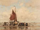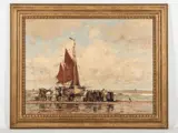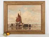 Het aangeboden schilderij toont een fraai strandgezicht met een bomschuit in Katwijk.Het schilderij is in een goede conditie en ingelijst in een houten lijst.