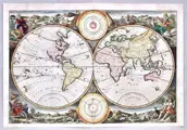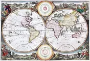 Handgekleurde WERELDKAART in 2 hemisferen; de 4 hoeken bevatten allegorische voorstelling van Europa, Azië, Afrika en Amerika. Boven en onder 2 cirkels met voorstellingen van het zonnestelsel. De bovenste cirkel heeft de zon als middelpunt (Copernicus), de onderste de Aarde als middelpunt (Ptolemaeus).