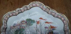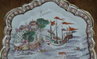 Zeldzame Pattipan met havendecor met zeilboten en jonken in de haven. Oostindische cy met polychroom decor en goudgehoogd. Qing Dynasty 1644-1911.Verkeerd in perfekte staat met lichte goudsleet op de randen en ribben, heel normaal voor de ouderdom. Diameter 15 cm, hoogte 2,3 cm.
