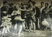 Marilyn Monroë gaf op Ebbets Field in Brooklyn de aftrap voor een voetbalwedstrijd tussen het Amerikaanse All Stars-team en het Israëlische team van de Hapoel-club.