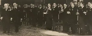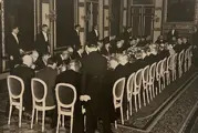 Persfoto Déjeuner in de Treveszaal, Binnenhof, Den Haag. Ook een foto van Churchill in de Ridderzaal Den Haag samen met Nederlandse politici, deze foto komt uit de collectie van de Gemeente Den Haag.