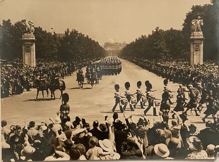 Een algemeen beeld toen de koning zijn troepen door de Mall leidde na de ceremonie, gadegeslagen door opgewonden menigten.
