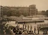 Officiële persfoto van de repetitie van de Trouping the Colour op de Horse Guards Parade, Whitehall. De repetitie was op 15 juni, de officiële Trouping the Colour op 23 juni, de geboortedag van koning Edward VIII.