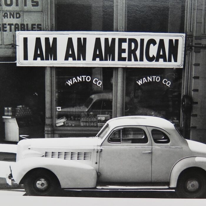 De foto toont de Wanto Co.-winkel op 401 - 403 Eighth en Franklin Streets in Oakland, Californië. Het bedrijf was eigendom van de familie Matsuda. Tatsuro Matsuda, afgestudeerd aan de Universiteit van Californië, heeft het "I am an American"-bord besteld en geïnstalleerd.
