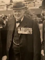 De heer Winston Churchil, die First Lord of the Admiralty was tijdens WW1, woonde de hereniging bij van de Royal Naval Volunteer Reservere en het Royal Naval Depot in Crystal Palace. Londen. Op de foto (van links naar rechts) Sir Ian Hamilton (Gellipoli Campaign), de heer Winston Churchill en admiraal Sir Roger Keyes.