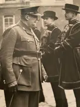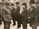 Persfoto van de eerste Easter Church Parade in oorlogstijd van de Yeomen Warders in de Tower of London. Zij werden geïnspecteerd door luitenant-kolonel L.N. Faviell, resident gouverneur en majoor van de toren. Aangezien dit de eerste parade in oorlogstijd was, droeg de gouverneur kaki in plaats van het gala-uniform van vredestijd.