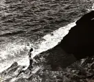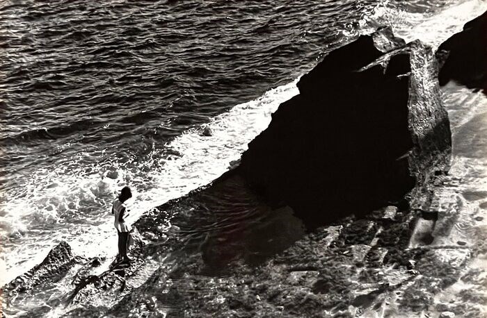 Schitterende foto getiteld Seaside, een rots waar de golven naar beneden komen en een wandelende vrouw.