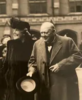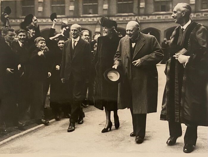 Churchill erkent gejuich uit de schooltijd van Bancroft School terwijl hij, samen met mevrouw Churchill, over het terrein naar de Grote Zaal loopt.